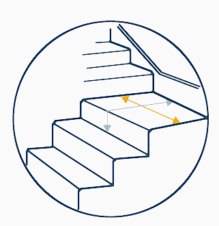 6. If you have a half landing, measure the width across the half landing (see the orange line), then measure the length of the half landing including the drop over the step and down to the back of the next tread (see the grey line).